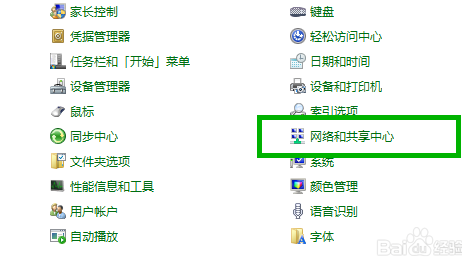 下一步回到控制面板设置界面,打开“网络和共享中心”