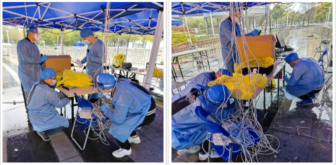 △分公司员工冒雨为核酸检测现场进行网络保障