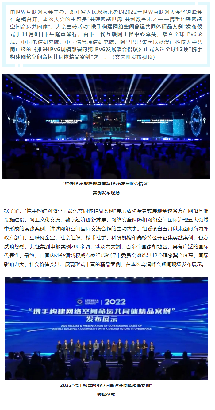 《推进IPv6规模部署向纯IPv6发展联合倡议》入选2022世界互联网大会“携手构建网络空间命运共同体精品案例”