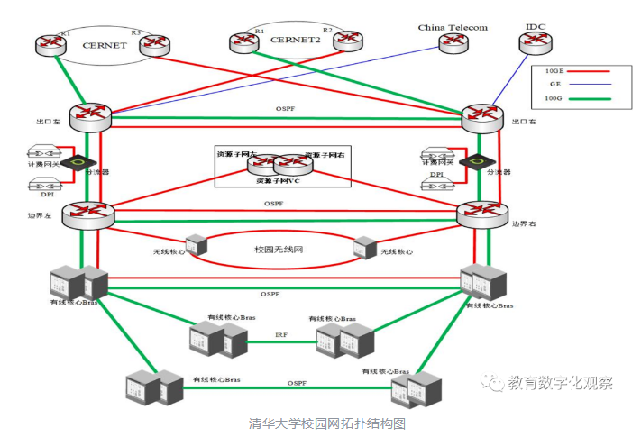 下图所示为清华大学校园网的拓扑结构。实际上我们在考虑网络架构时,不用过于关注接入,因为接入并不会对拓扑结构有实质性的影响。我们大家的工作,更多还是集中在整体架构的运维上面。
