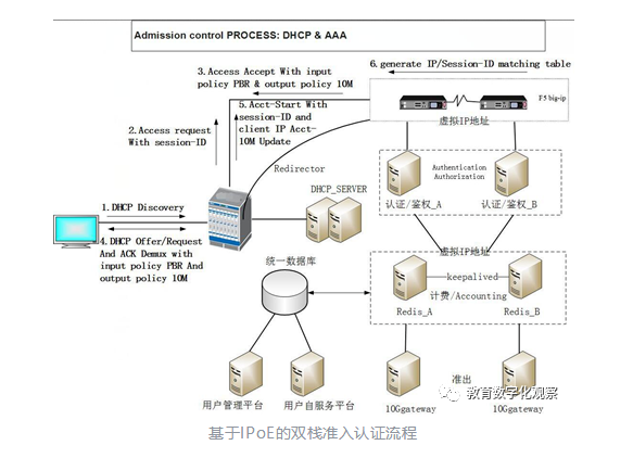 以下是基于IPoE的双栈准入认证流程。用户终端接入校园网,首先发起DHCP Discovery报文,报文到达BRAS设备后并不是直接转发至DHCP服务器,而是生成一条Session并将这条Session转发至AAA服务器,该Session包含用户终端MAC地址,DHCP Option选项以及系统预置的NAS账号和口令,AAA服务器收到本次请求,根据BRAS递交的账号可以向BRAS下发不同的策略,例如下发该条Session上行带宽4Mbps,下行带宽10Mbps等不同的策略。